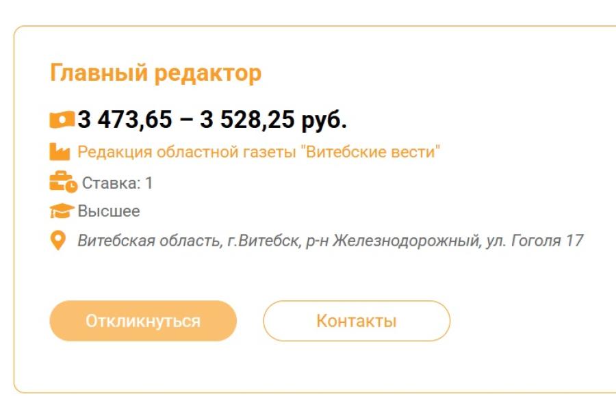 Абласная газета «Витебские вести» ужо 4 месяцы працуе без галоўнага рэдактара. Чаму гэтую пасаду пакінула былая рэдактарка Наталля Камлева – не вядома. Таму, хто ўзначаліць выданне, абяцаюць заробак 3 473,65 – 3 528,25 руб. Гэтаксама ў «Витебские вести» патрэбны рэдактар інтэрнэт-рэсурсаў ( заробак 1 049 – 1 289 руб.) І ажно 4 карэспандэнты – два на палову стаўкі ( заробкі адпаведна 750 – 970 руб. і 700 – 891 руб.) і два на поўную стаўку, ім абяцаюць плаціць 1 077,40 – 1 482 руб. і 1 425 – 1 660 руб.